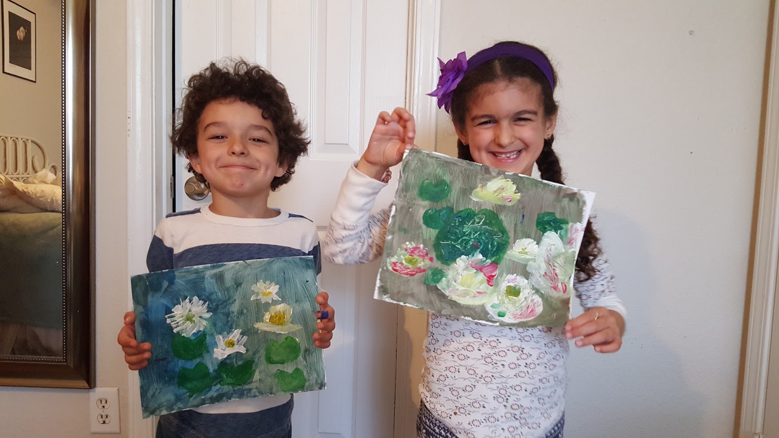 For Math we played "Make a 10 game" for the 5 year old's sake and my 7 year old updated her $$ balance book. Then we learned about Monet, watched Mike Venezia's video, draw caricatures and painted lilies. Kids wanted to play with Magic sand, poly pockets, and cars - all in the same time, so that happened.